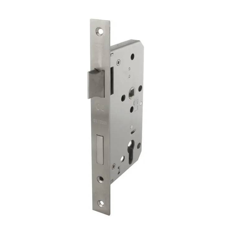 Material: Frente, lingueta e trinco: aço inox, caixa de fechadura: aço